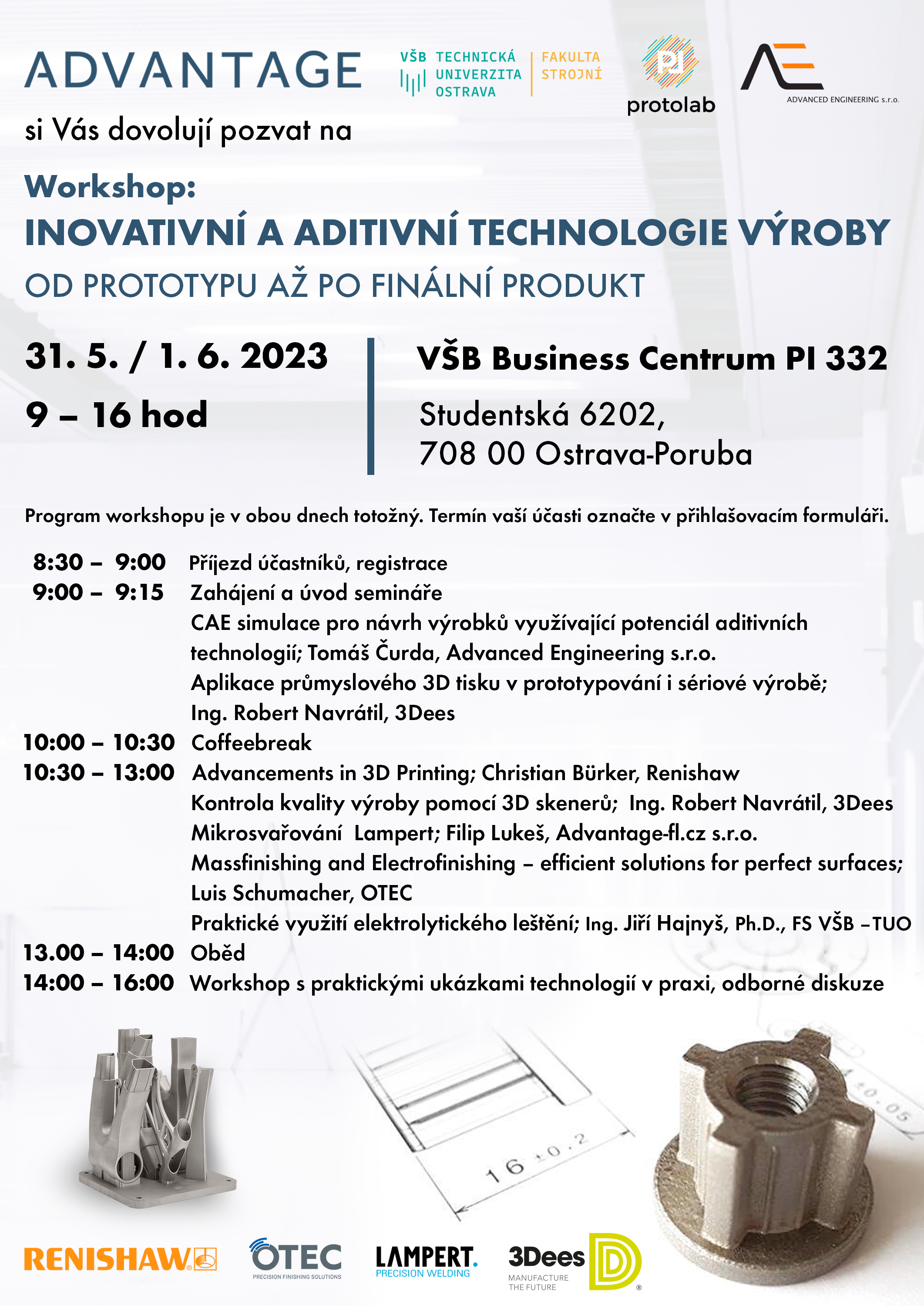 V dopoledním semináři vystoupí odborní řečníci a v odpoledním bloku proběhnou praktické ukázky zařízení využívaných v aditivní výrobě.